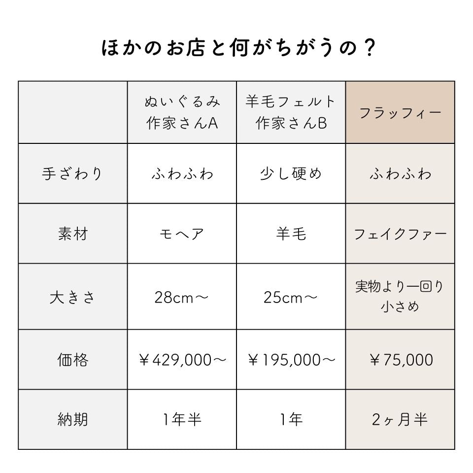 We compared the Fluffy stuffed animal (far right) with other custom-made shops in several areas, including price and delivery time.