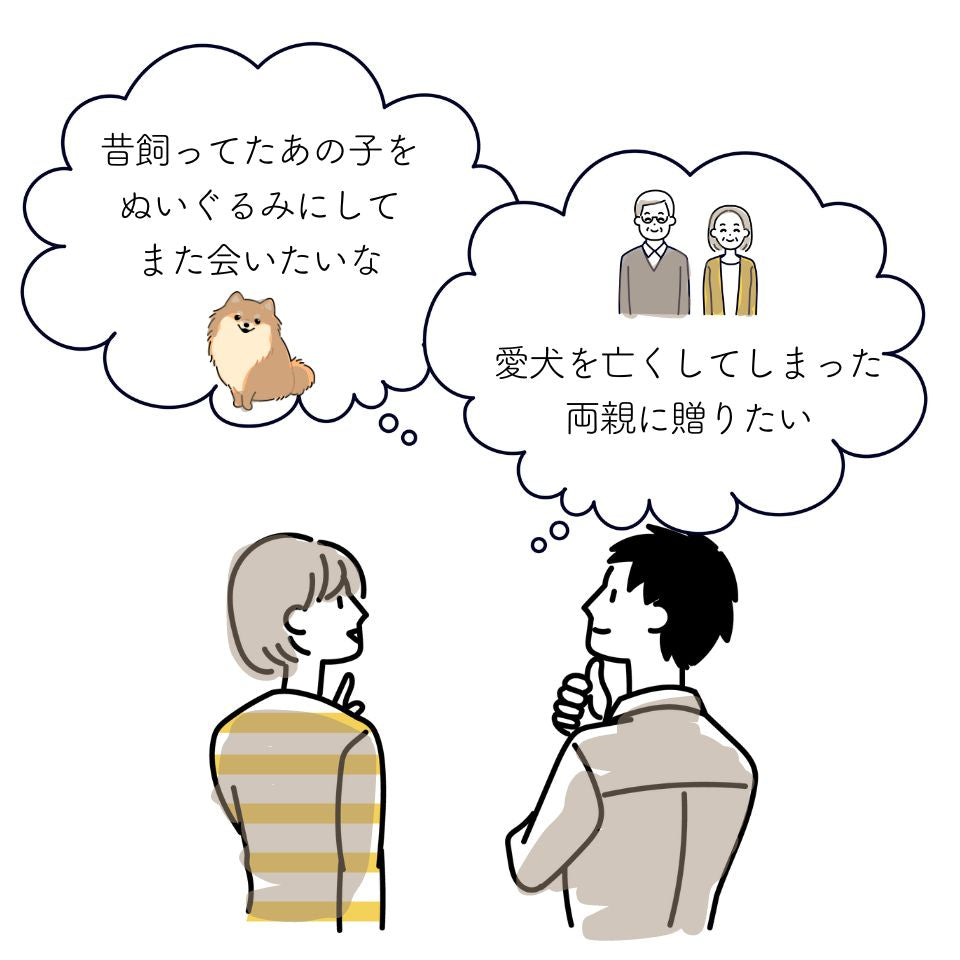 We also receive many requests from people who want to make stuffed toys of deceased pets. It is also possible to add a small pocket to hold the pet's ashes or fur.