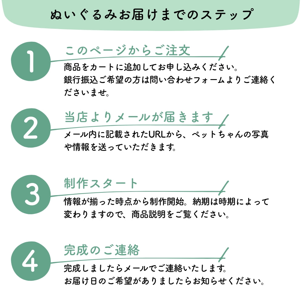 ・ぬいぐるみの仕様上、完璧にそっくりにはできない場合がございますことをご了承くださいませ。